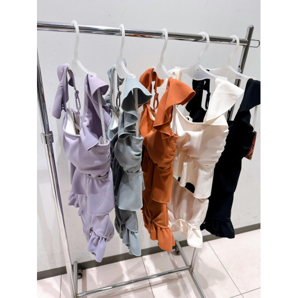 어깨, 버스트 아래, 다리의 프릴이 보디 라인을 커버.