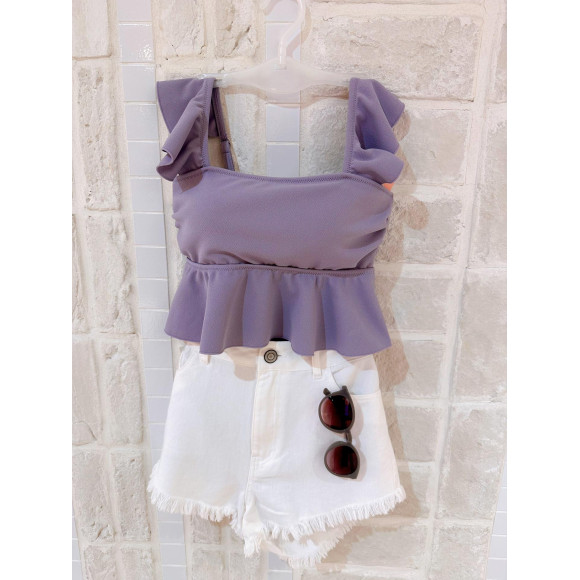 복고적인 인상의 플레어 탑스와 박스 디자인 쇼츠의 비키니입니다♡